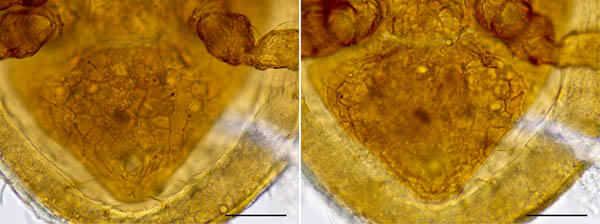 ホコダニ科は顎体部小角が著しく長いことが特徴、背板毛は単純毛の他、スプーン状、槍状など、
